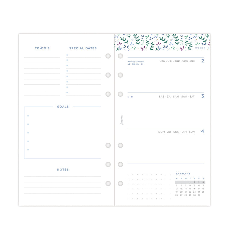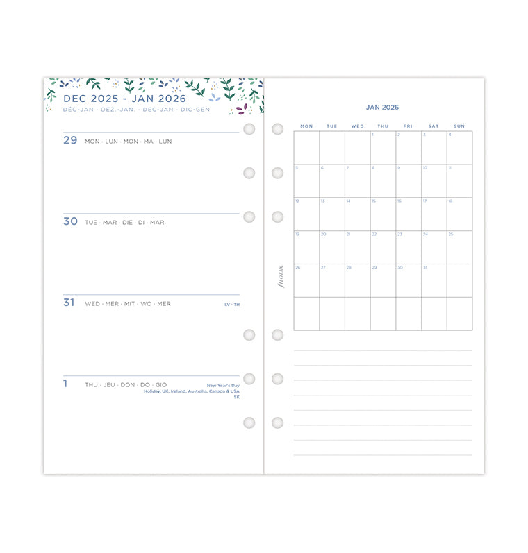 Plan ahead in our diary refill from the Garden Collection. This blooming floral Personal refill offers a horizontal week to view layout with beautiful design accents for inspiring creativity and joy. Features a “Belongs to" page designed for adding a personal touch. Calendars of the current and next years are included to give you the chance to plan ahead, while the friendly dashboard pages invite the beginning of a new month. Discover the “Big Plans" section with dotted pages for monthly goals. At the end of the diary, you can also find dotted and ruled pages, perfect for your notes and doodles.
